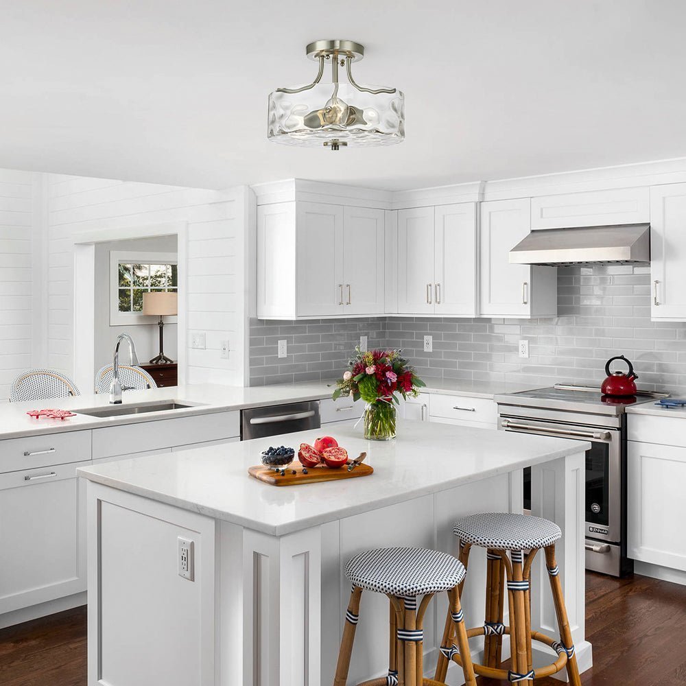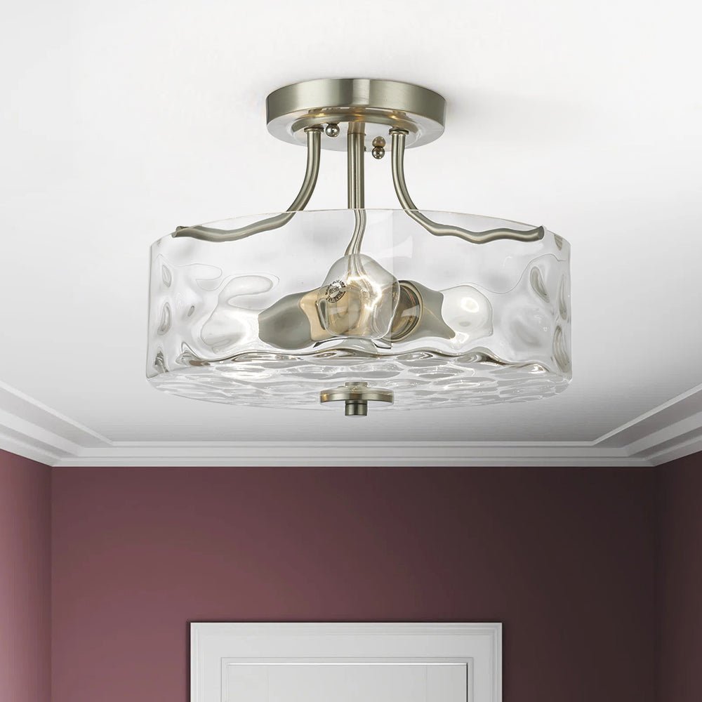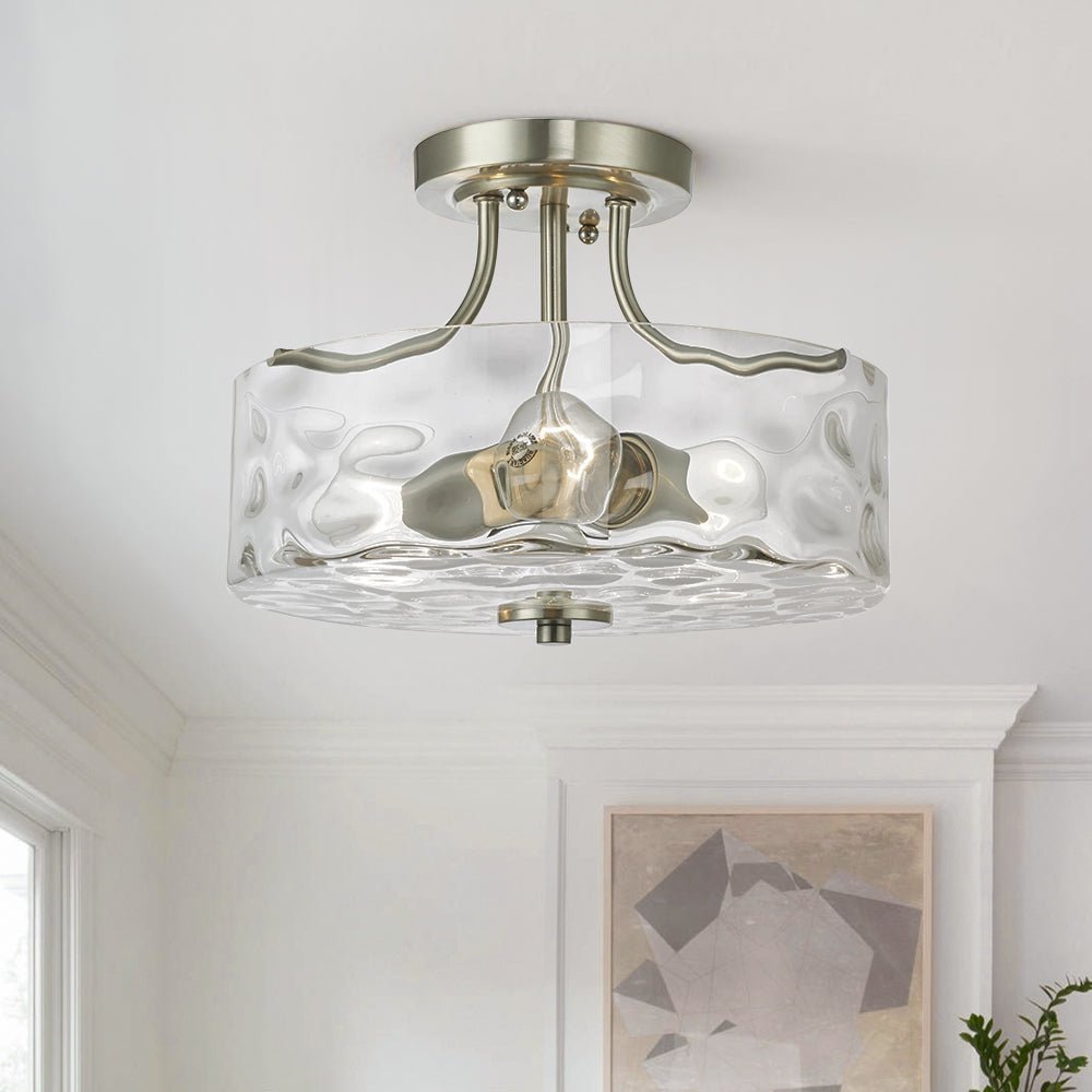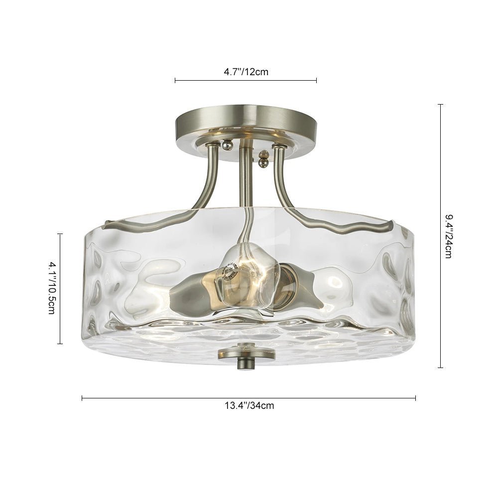 This round flush mount lighting comes in a 3-arm metal frame in nickel finish, which supports a drum-shaped hammered glass shade at the bottom. Designed to take two E26/E27 medium-base bulbs (excluded), this hammered glass semi flush ceiling light offers glistening lighting like the water ripple to wash your ceiling and space. We love to mount this brushed nickel ceiling light to the entryway, bathroom, kitchen, corridor, and bedroom.